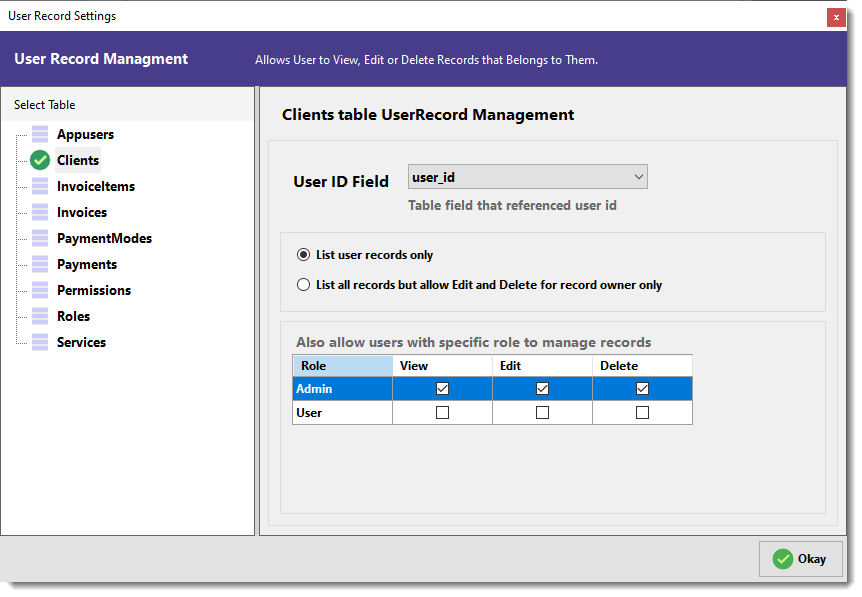 Two roles—Admin and User—are added by default. Select a role from this list to begin assigning permissions. Click the green button with the plus sign to add new roles, and the red button with the cross sign to delete any existing role. Make sure you have at least one Admin Role that has access to all tables and pages to avoid getting locked out of your own application. - Table Selection