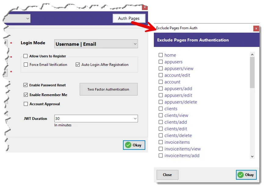 Sometimes, you may want specific pages to be publicly accessible—like a help page, public product list, or signup page. That’s where the Auth Pages button comes in.