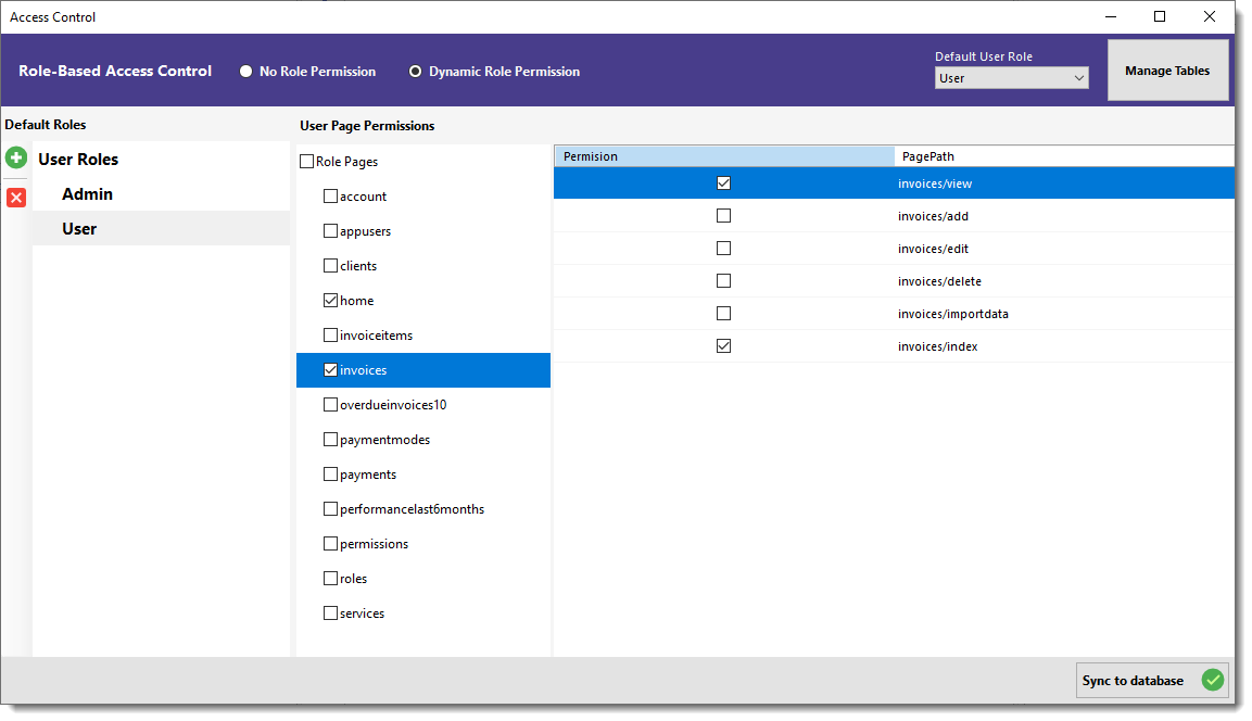 Click the Sync to database button once your role permissions are set. This saves all configurations directly to the database for use in your application.