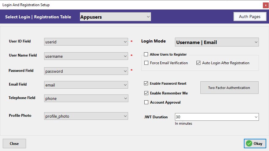 - JWT Duration – Set token expiration time in minutes for secure API-based apps.