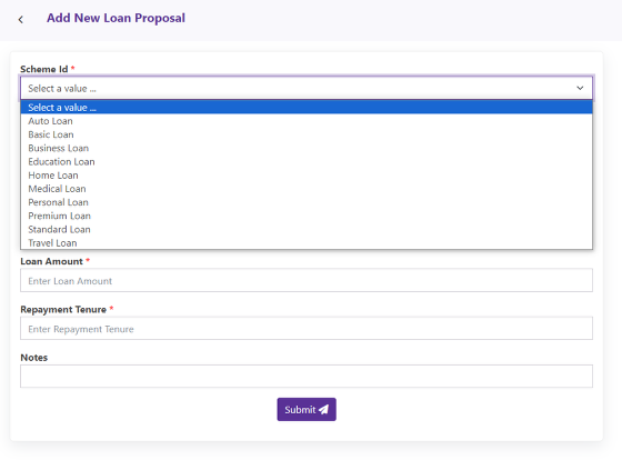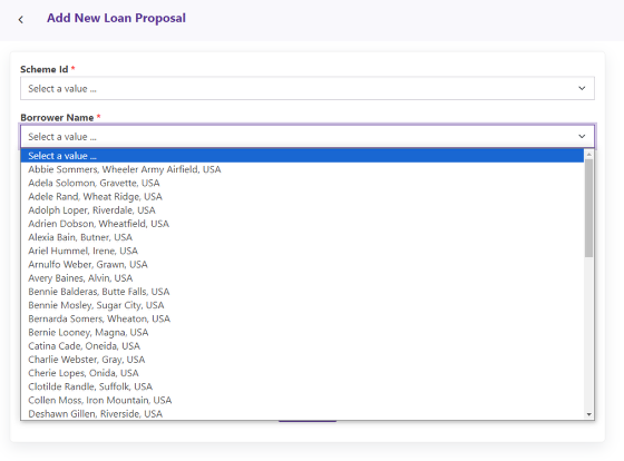 For "Add" page of loan_proposals table, we will set up two dynamic SELECT controls, one for scheme_id in which we will load the names of actual schemes in the SELECT control and the second is borrower_name where we will populate the SELECT control with the name, city and country details from members table.