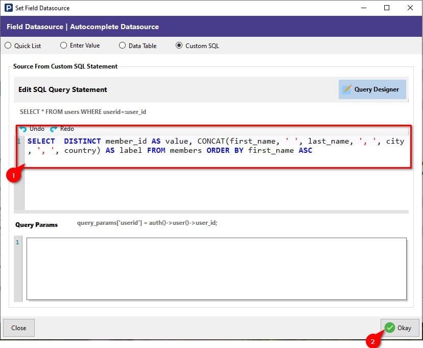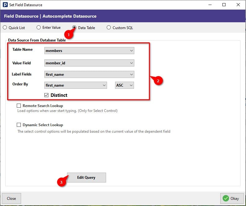 - Edit Query: If we leave the above settings, the SELECT control will load only the first_name from the members table. We want to append Last Name, City and Country information to it. For that, we will edit the query by clicking the button Edit Query.