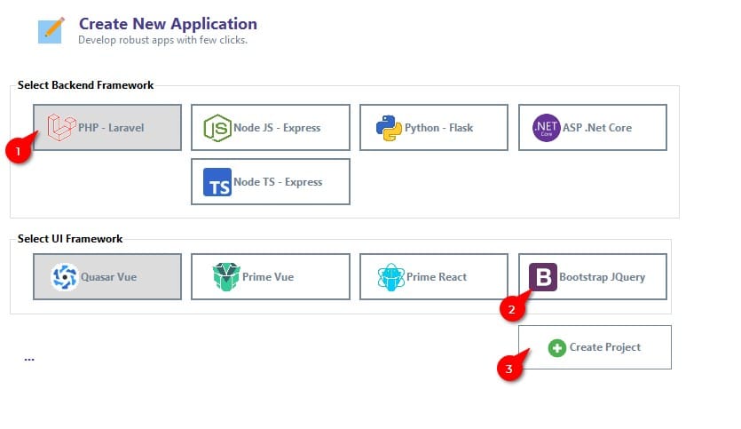 Start Radsystems Studio and select "PHP-Laravel" as back-end and "Bootstrap jQuery" as front-end framework. Click "Create Project" button to move on to the next step.