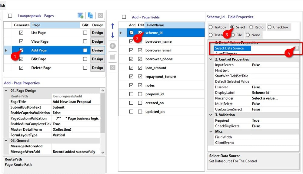 - Since we want to load the scheme names from loan_schemes table, we will first change the field type for this field to "Select".