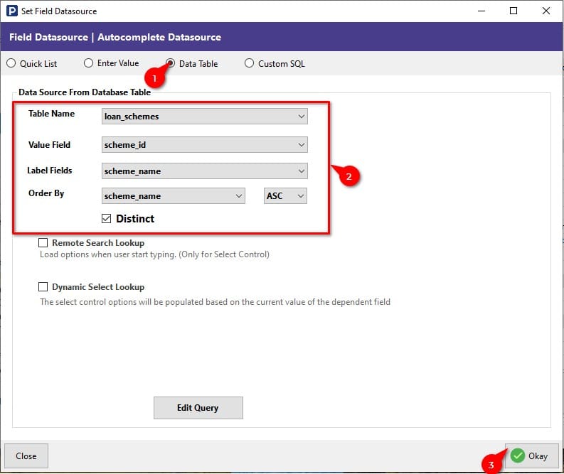 - Table Name: Select the table from which you want to fetch the options. In this example, loan_schemes.